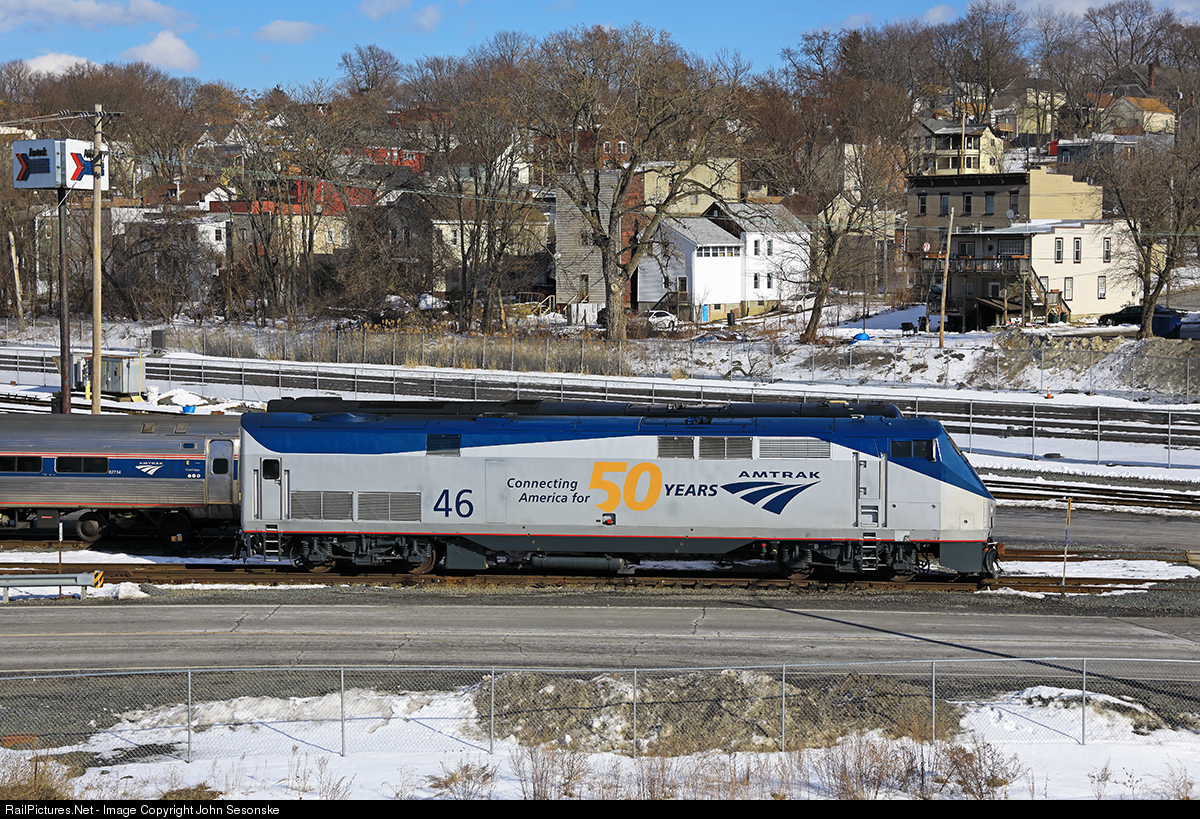 After leading Empire 284 in from Niagara Falls, the Amtrak Phase V 50th Anniversary engine sits in the yard at the Rensselaer shops. This is the first of 6 engines to be painted in 50th Anniversary commemorative schemes. AMTK 705 is in the background.