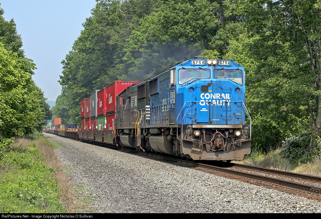 | Now-abolished NS 24V with a pair of SD60 type locomotives. Behind the widecab leader, still in Conrail paint, is NS 6709 (a standard cab SD60). The leader formerly was CR 5646 and the trailing unit formerly was CR 6854. Both units were sold to Progress Rail in in July of 2019 and August of 2019, respectively. |