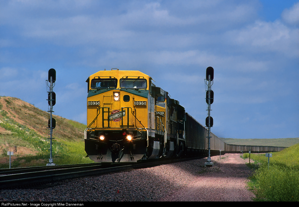 An eastbound coal train, led by Chicago & North Western GE AC4400CW No. 8835, rumbles through Wolfe, Wyoming, on the Union Pacific’s Powder River Subdivision on July 6, 1996.