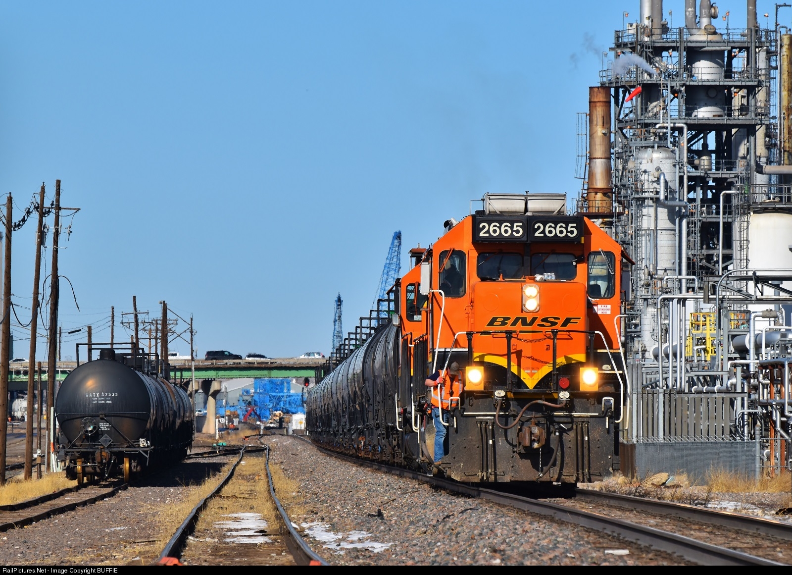 BNSF 2665 brings a string of oil cans from Hudson, Colorado to the refineries in Commerce City. 2665 started life with the AT&SF in 1965 as a GP35 and was later rebuilt as a GP39-3 for the BNSF.