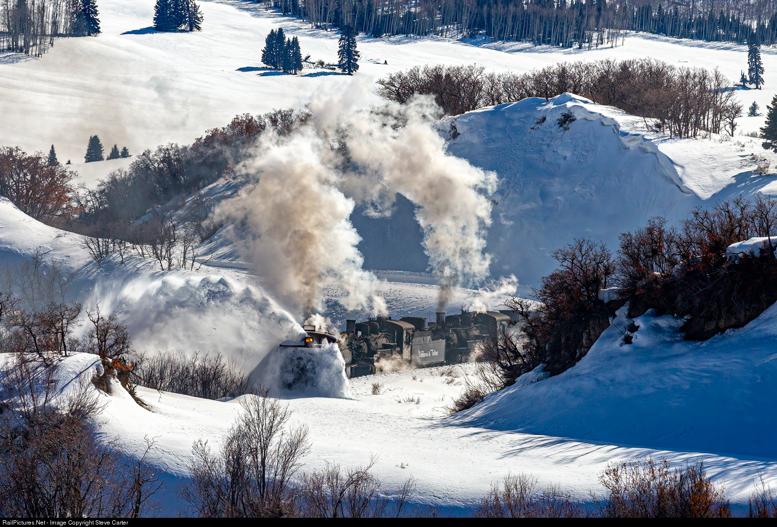 Steam powered rotary snowplow OY is pushing through some of the larger drifts on it's way to the Colorado/New Mexico border, where the days work will end. Hardly a soul around to see this extravaganza. Oh! wait, there might been a few other people in the area.