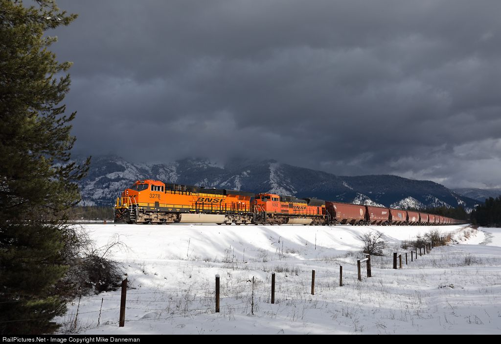 The sky darkens, signaling winter storms approaching the Clark Fork Valley of Montana on the afternoon of February 5, 2021, as a westbound BNSF grain train crosses the causeway separating Frog Pond from the river between milepost 56 and 57 at Trout Creek.