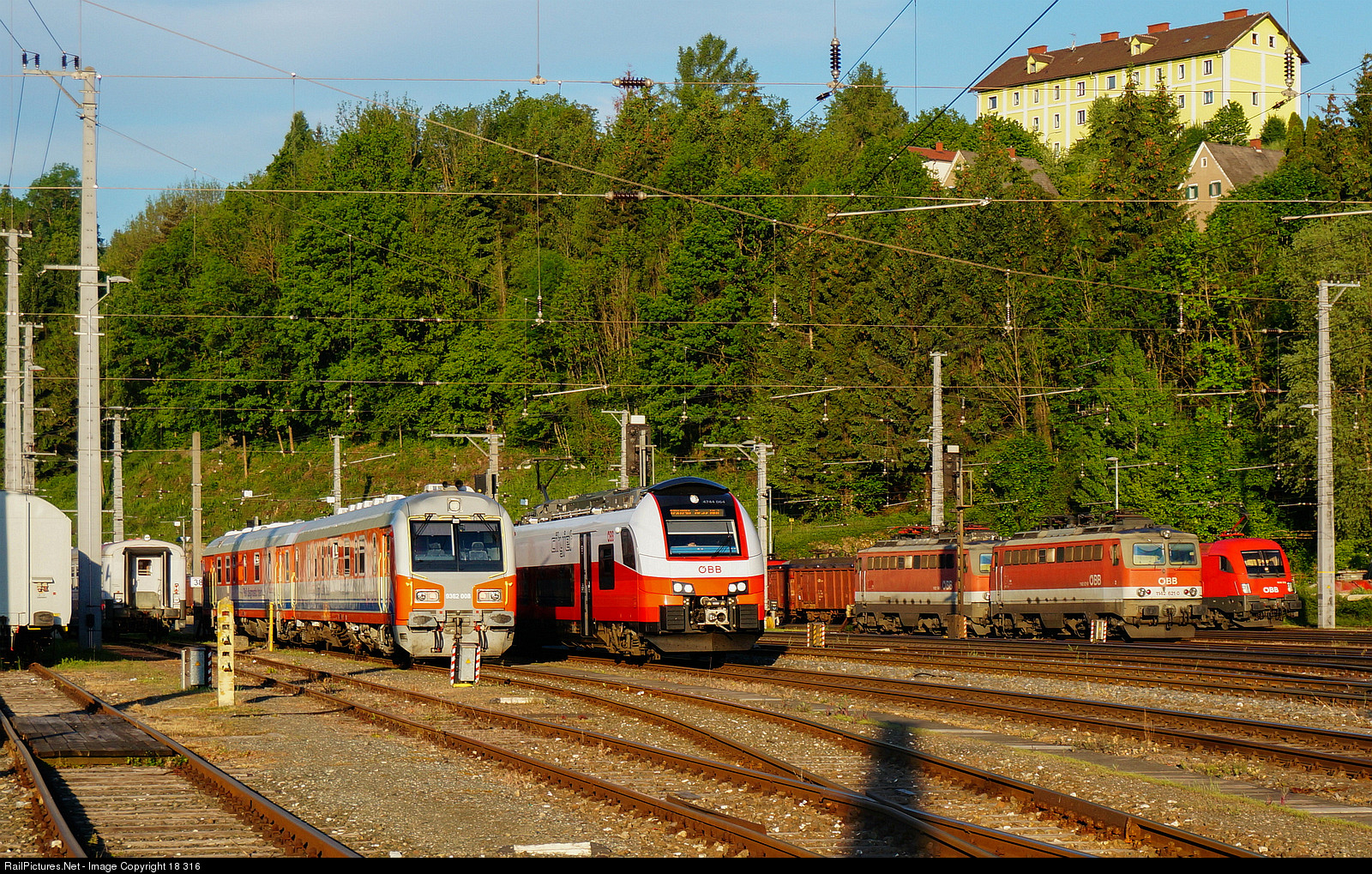 Busy morning in Leoben: left to right, parked tunnel rescue wagons, parked Hungarian track measuring DMU FMK-008, departing EMU ÖBB 4744 064 on a Neumarkt in Steiermark to Graz regional express service, ÖBB 1142 621 and one of her sisters just arrived to park after helping a freight train climb a nearby mountain pass, and an unidentified ÖBB 1016 just arrived with a freight train and will soon follow the passenger train at block distance.