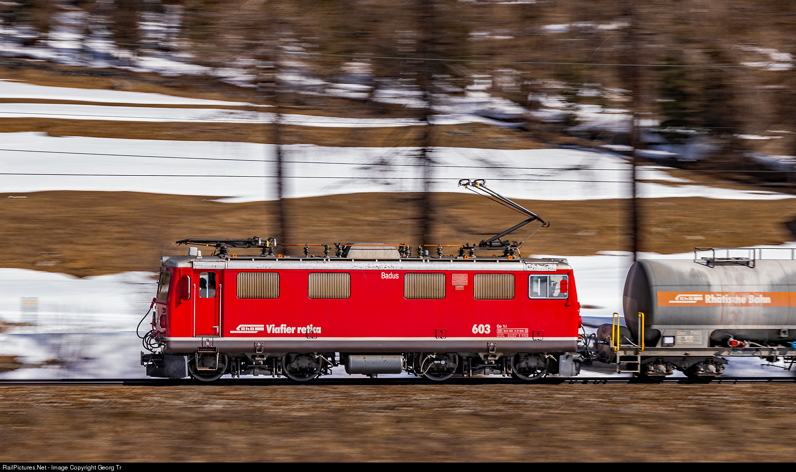 More than 73 years old, but still faster than some younger... Ge 4/4 I # 603 "Badus" of the Rhaetian Railway is delivering ciment for the construction works of the Albula tunnel II, speeding as train 6132 from Samedan to Preda through the Bever valley. The 1180 kW locomotive was delivered to the RhB on august 13th, 1947 by SLM, BBC and MFO, then in green color and a different appearance. Pan shot with 1/30 second.