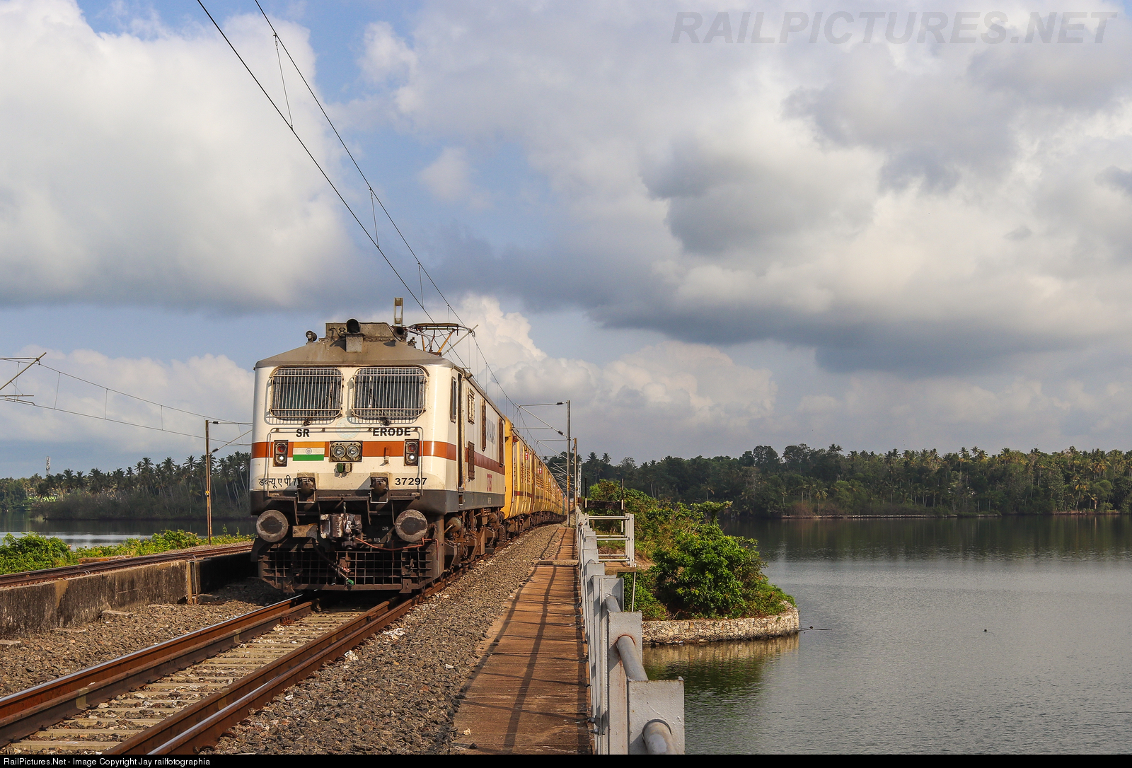 Clean ERODE WAP-7, under partially cloudy sky crossing Paravur lake with Thiruvananthapuram Central bound VANCHINAD Express