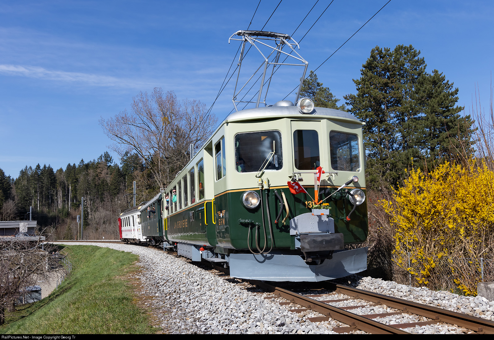 The meter-gauge line from Bulle to Broc-Fabrique of the former Gruyère-Fribourg-Morat (GFM), today Transports publics fribourgeoise (TPF) will be closed from April 6, 2021 and converted to a standard-gauge line. To say goodbye to the previous operation, older vehicles from the stock of the association GFM Historique ran on March 27 and 28, 2021 all timetabled trains. Railcar Be 4/4 # 131, built in 1943, is running train 14960 of the line S 60 from Bulle to Broc-Fabrique, between Les Marches and Broc-Village. The intermediate car is B4 # 811, former Blonay-Chamby Railroad Museum, former SBB Brünig line. In the rear is railcar BDe 4/4 # 141 of the association GFM Historique, former TPF/GFM, built in 1972.