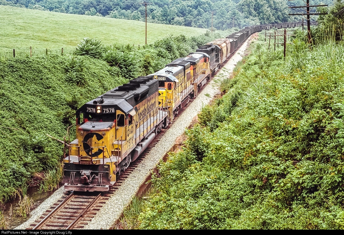 A ”pure” (no B&O, no WM) Chesapeake & Ohio power set leads a westbound C&O train consisting mostly of stone loads near Ivy, Virginia. The SD40, U30B, and B30-7 in Chessie paint are trailed by an SD40 still in Enchantment Blue.