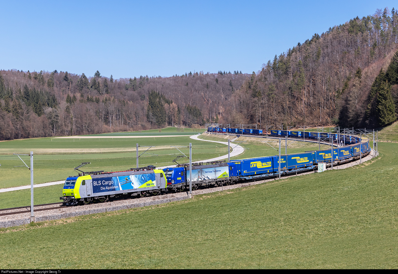 Bombardier TRAXX F140 AC1 Re 485 # 003 of the BLS Cargo (built 2003) and Siemens Vectron 193 # 494 of the Hupac, rented to BLS Cargo, in multiple control, are pulling the southbound "LKW Walter" (forwarder) train 43575 from Genk Luterade/Belgium via Lötschberg-Simplon to Padova/Italy, through the "Grafenschüre" curve between Wynigen and Burgdorf.