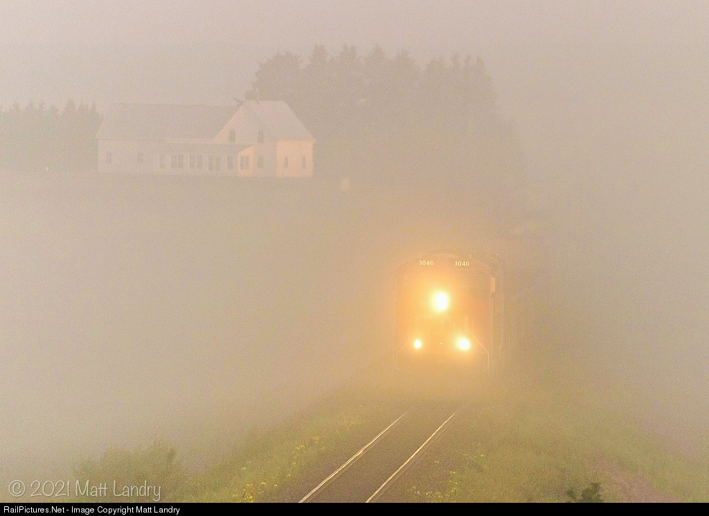 | In thick early morning fog, CN train 120 crosses the border from New Brunswick, into Nova Scotia, see from Fort Lawrence, Nova Scotia. |