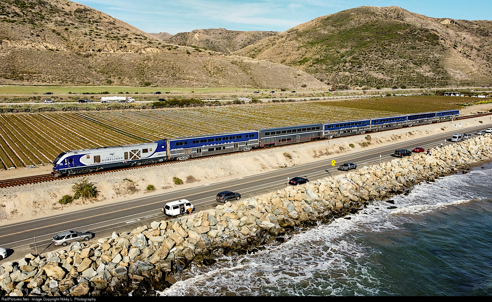 The Surfliner living up to its name as it passes through Seacliff siding.