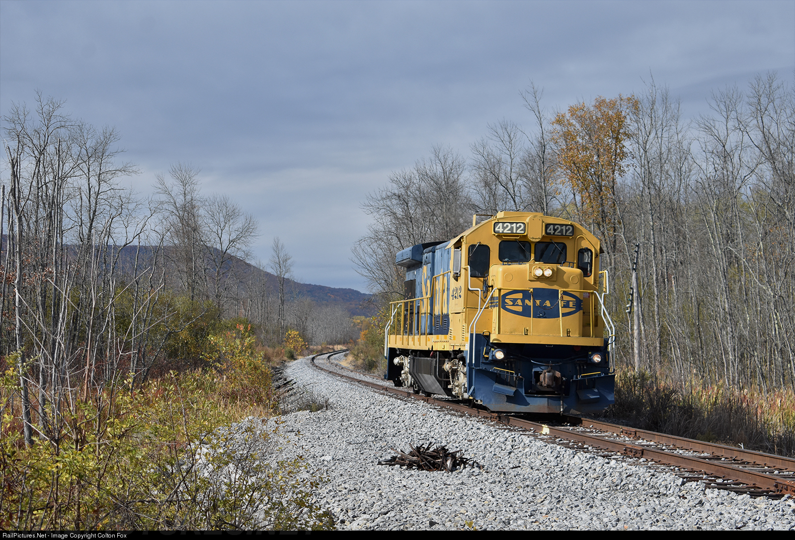 | NE-1 with the SLRS (SMS) 4212 returns to Guilderland, NY in the early afternoon after running to Delanson, NY with freight cars for interchange to Norfolk Southern. This B23-7 is original to the Santa Fe, and still wears its iconic Yellowbonnet paint scheme. |
