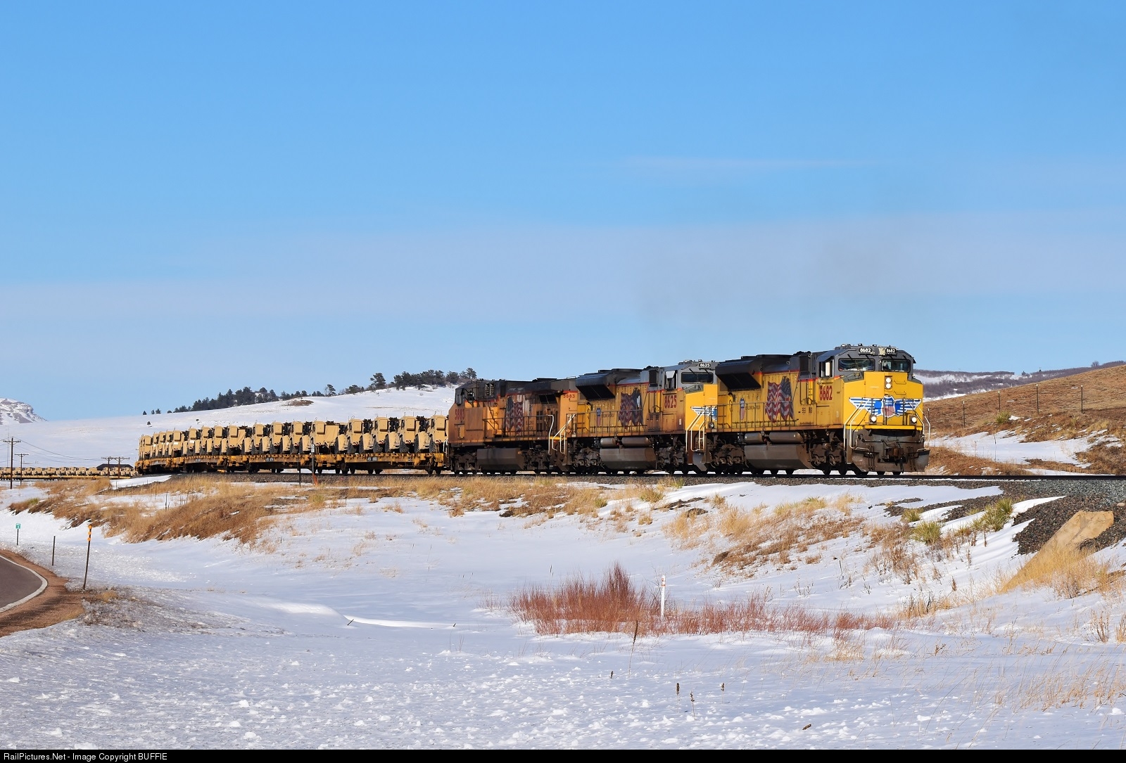 UP 8682 (SD70ACe) leads a military train through the S curves just north of Palmer Lake, Colorado.