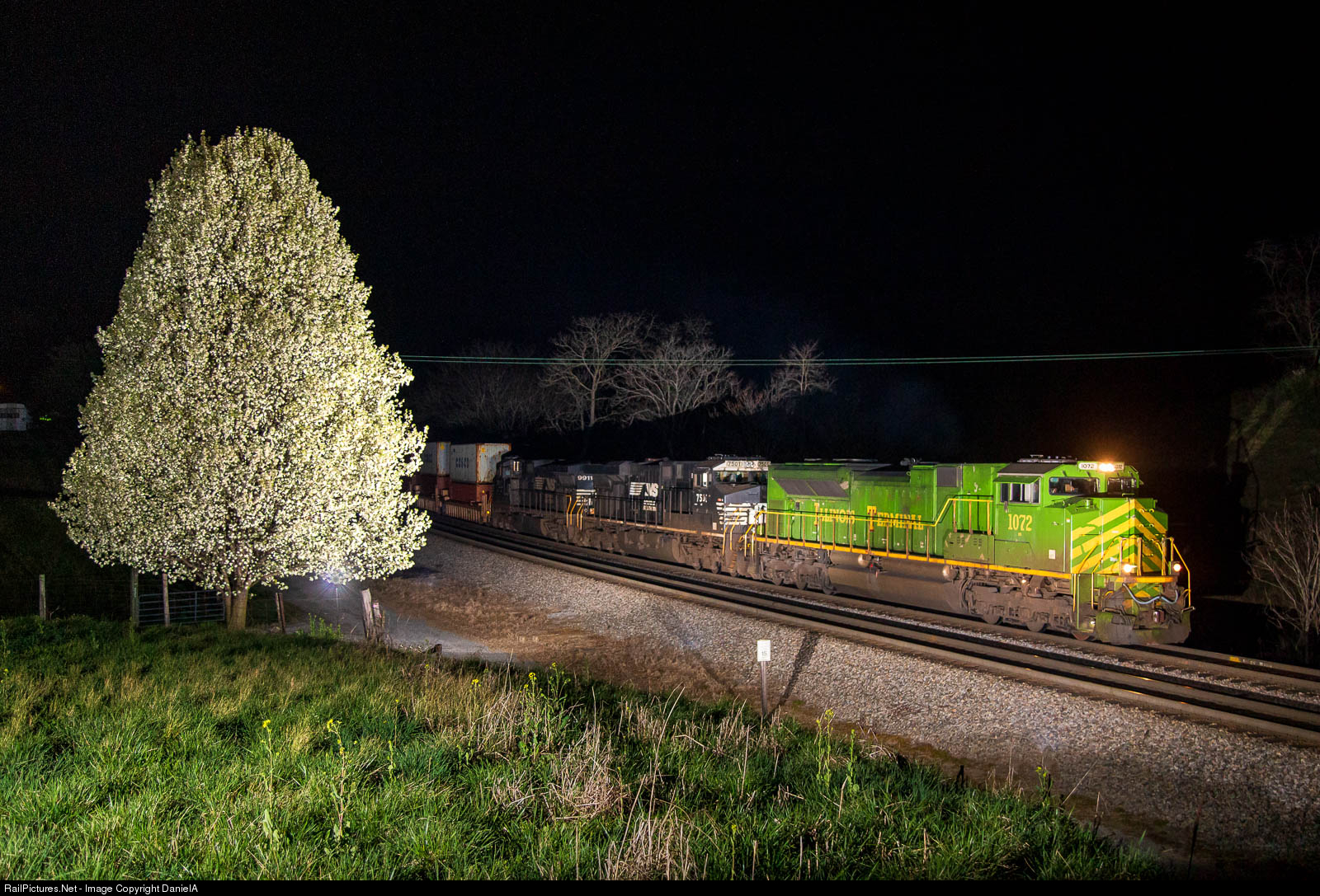 Under the cover of darkness, NS 29G rushes west through Shawsville, Va by a blooming Bradford Pear tree. The Illinois Terminal heritage unit leads the train and pops nicely at night with flashes.