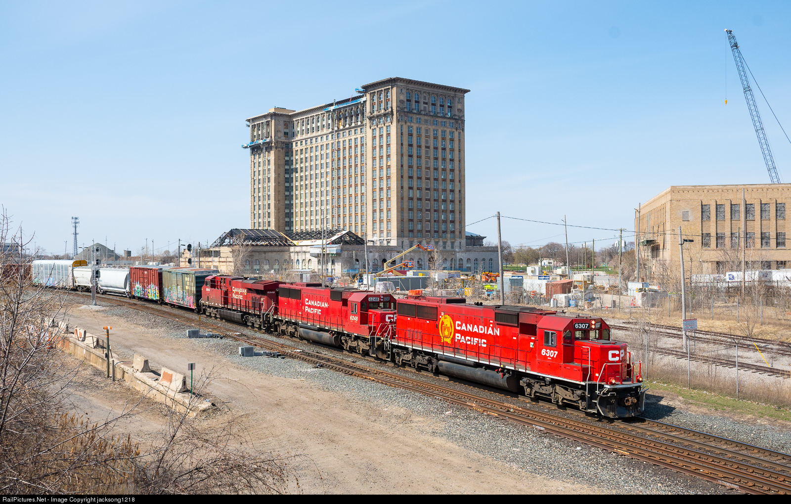 | Canadian Pacific train T27 ( Windsor, ON - Oakwood Yard - Detroit, MI (NS)) turn approaches the Detriot - Windsor tunnel as it passes the Michigan Central station with a pair of EMD SD60s leading a GE. The station is currently undergoing restoration by the Ford Motor Compay and is planned to house their autonomous driving headquarters when it is finished. |