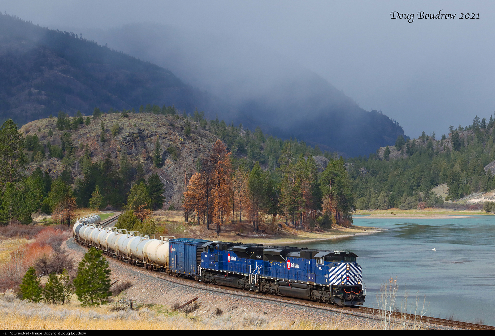 The Montana Rail Link Day Gas Local is seen headed East at Perma, Montana on the return trip to Missoula from Thompson Falls. The weather rapidly changed multiple times on this chase allowing for some pretty dramatic lightning