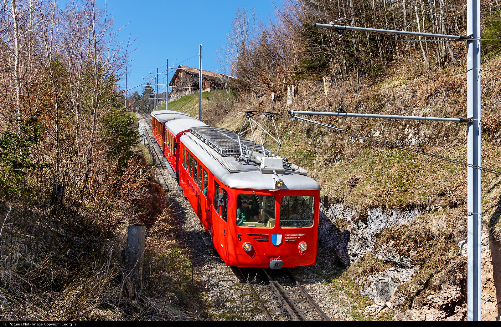 | Cogwheel railcar BDhe 4/4 # 5 (built in 1965 by SLM, SIG and BBC) of the Rigi Bahnen is running down the 25.0 % grade below Freibergen towards Grubisbalm through a rock cut, with first train CC 1134 from Rigi Kulm to Vitznau. The cars are B # 7 from 1872, B # 15 from 1899 and B # 5 from 1871. This train has a capacity of 220 seats, about 1/2 more then the push-pull trains BDhe 4/4 # 21/22 with cab cars Bt # 31/32. The 7 kilometer long standard gauge Vitznau-Rigi-Bahn was opened in 1871 and is celebrating 150 years in 2021! Electrification was in 1937 with 1500 V DC. |