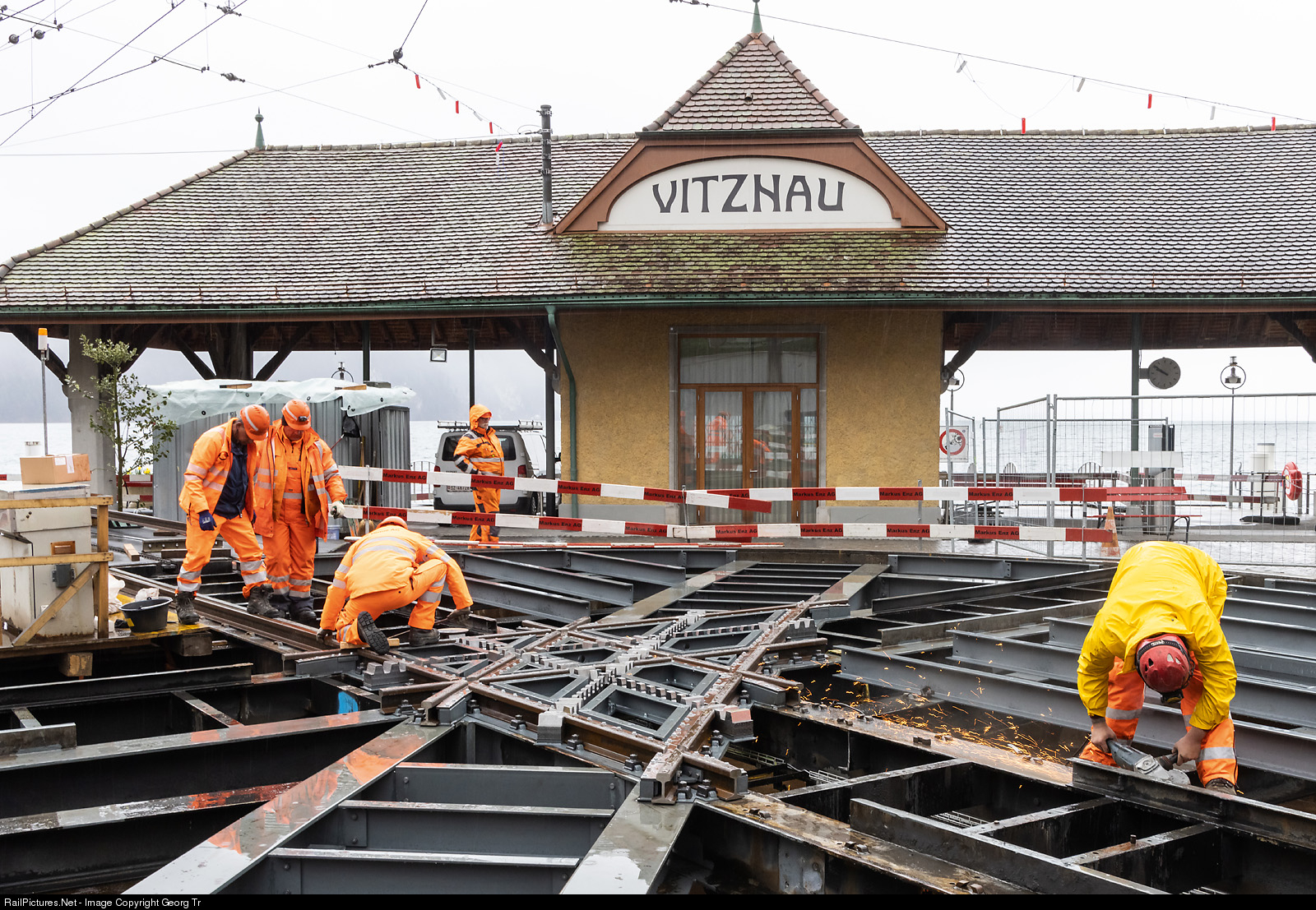 The rack railroad from Vitznau to the Rigi, opened in 1871 as the first mountain railroad in Europe, already had a turntable with two intersecting rack tracks at the bottom station to enable the connection between the 2 station tracks with the 8 tracks of the depot. Switches are not possible for this due to the local situation.Now, Rigi Bahnen has ordered 6 new double-unit railcars, which are longer than the tracks on the turntable/ the diameter of the turntable. In order to be able to drive from the two station tracks into three of the depot tracks without having to turn the turntable, 3 crossing tracks are now needed, two of which runs in a slight curve. The centerpiece of this technical masterpiece, unique in the world, has now been installed.
