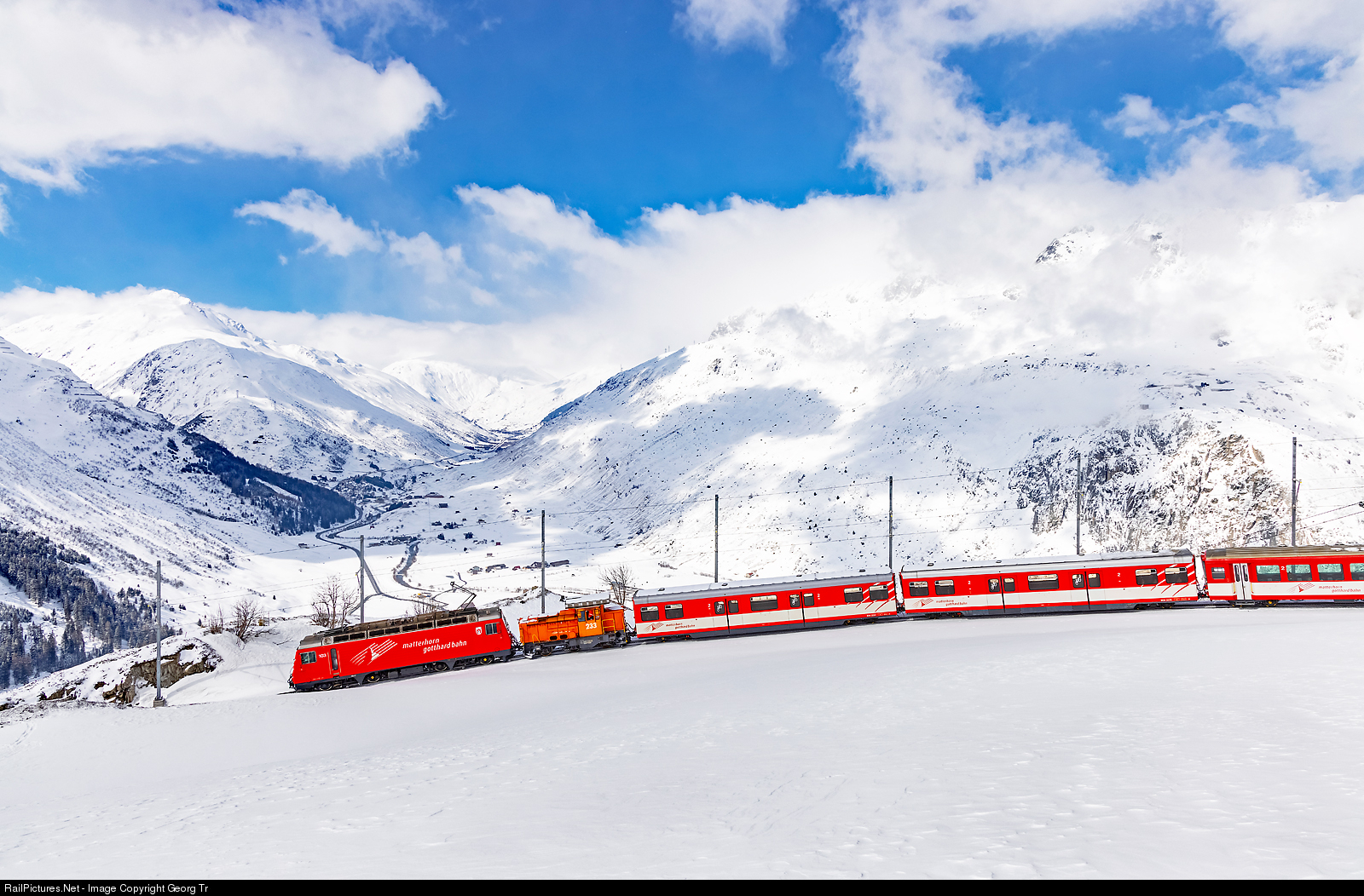The "Moyse" built (1975/76) diesel shunters Gm 3/3 # 231 to # 233 of the Rhaetian Railway were withdrawn, replaced by the new Geaf 2/2 # 20601 to # 20607. The association Dampfbahn Furka Bergstrecke (DFB) purchased this 3 diesellocomotives (at least 1 for spare parts) for shunting service in Realp and in the Furka summit tunnel. The locomotive have no cogwheel drive. To bring the "Moyse" over the Oberalp pass to Realp, each 34 ton locomotive had to be pulled in a separate train, behind the HGe 4/4 II # 103 "Chur" of the Matterhorn-Gotthard-Bahn (MGBahn) and 5 passenger cars behind, serving to brake in the rack sections. The first of this trains with Gm 3/3 # 233 is slowly running down the mountain between Nätschen and Andermatt. In the background Hospental and the new home base of the "Moyse", Realp.