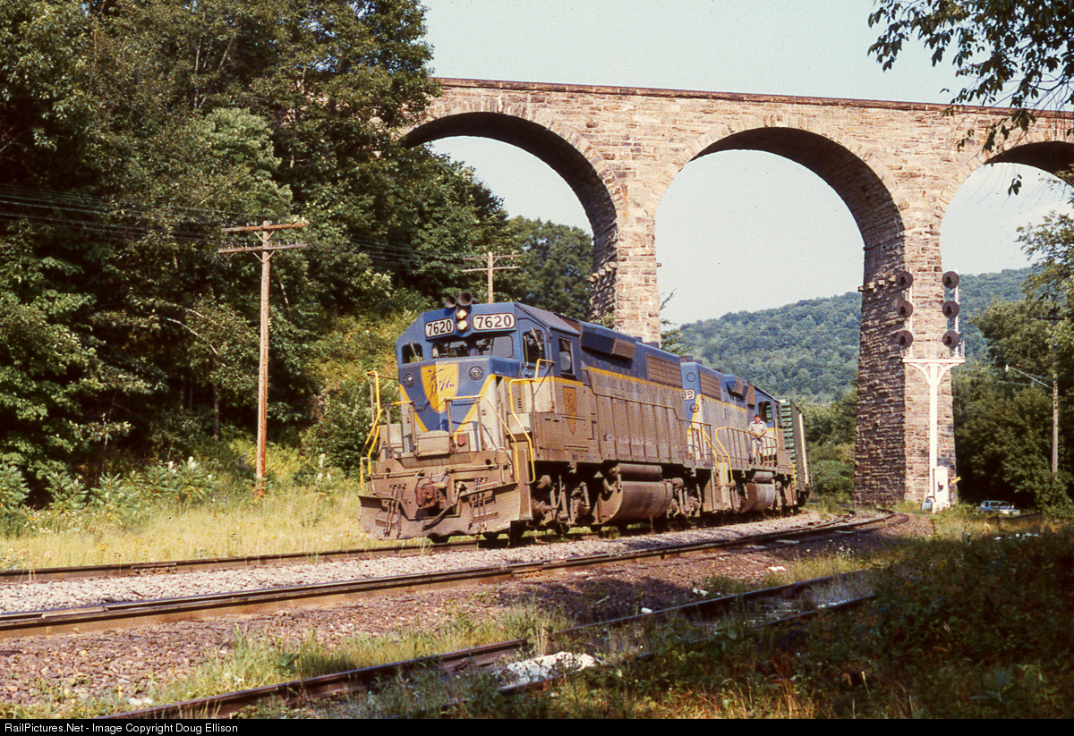 | DH 7620 leads a northbound freight over the D&H Penn Division, and under the Starrucca Viaduct, headed for Oneonta, NY. |