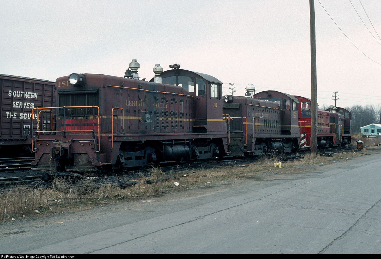 Here is the switcher lineup at South Plainfield yard on March 6, 1976. NW2 181, SW900 122, and two other switchers await their next assignment. In the background is the new yard office, a pre-fabricated building the LV put up during their last couple of months of operations due to the poor condition of the former passenger station that had previously housed the yard office. R. T. Steinbrenner Photo