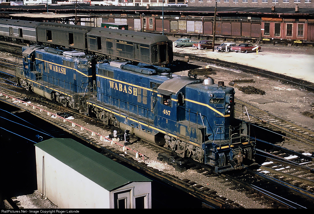 Two Wabash GP9's equipped with steam generators for passenger service, near Dearborn Station in September 1964. Al Holtz photographer, from my collection.