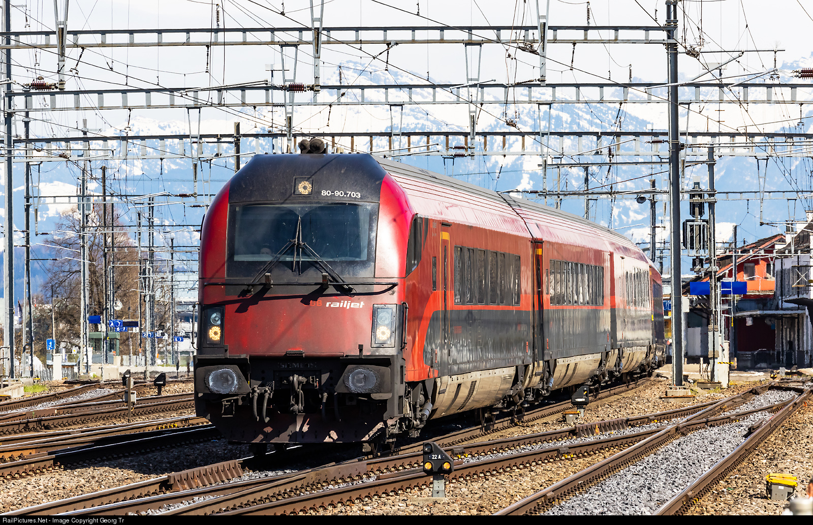 | RJX (Rail Jet Express) 160 of the ÖBB from Bratislava hlavna stanica/Slovakia via Vienna-Salzburg-Buchs SG to Zürich is running through Pfäffikon SZ. The train started in the early morning at 06.10 AM and will arrive in Zürich main station at 3.20 PM. Leading is the rather dirty cab car 80-90 # 703 and not visible locomotive 1116 # 203 is shoving in the rear of the push-pull train. |
