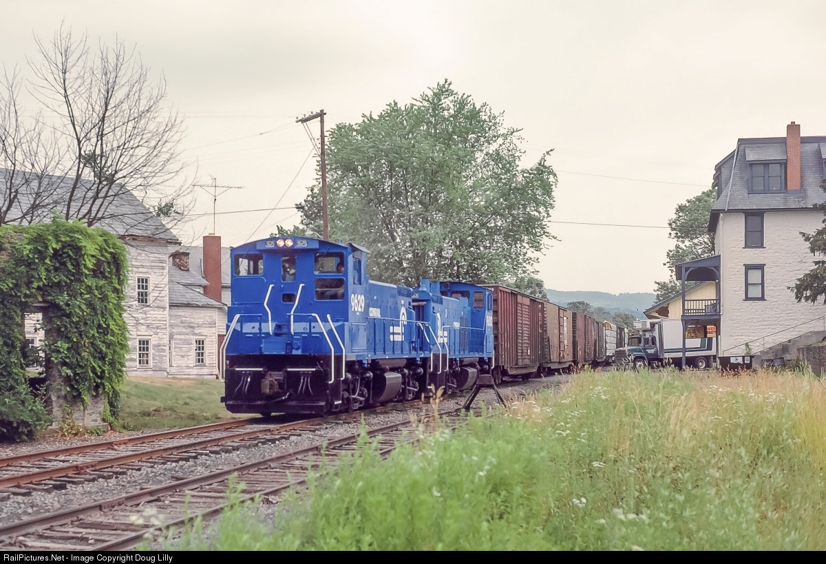 Probably no strangers to this line, two former Reading MP15’s lead Conrail local WHRE-10 through Reinholds, Pennsylvania. The building on the right is an 1863 hotel built by Col. Jesse Reinhold shortly after the adjacent Reading & Columbia Railroad was constructed. The entrepreneur, for whom the town is named, set up his hotel to be a ticket office for the railroad, as well as the local telegraph and post office. After the Colonel died in 1875, the railroad built its own station, and the hotel rebranded from the Reinholds Station to the Reinholds Inn. Today a restaurant in the hotel is called The Station at Reinholds Inn.