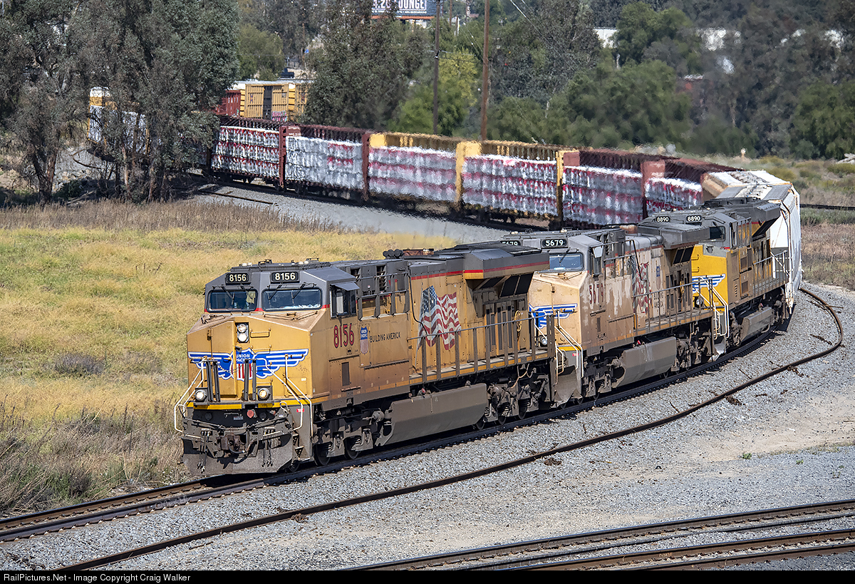 Union Pacific’s Alhambra Sub makes a pair of S-curves – think of a graphed bell curve – to get to West Colton Yard as they pass under the UP’s Mojave Sub just east of the yard. Getting back on (generally) tangent track is UP train MLFWC-06 (Laughlin TX to West Colton CA) behind a pair of faded units (ES44AC 8156 and AC4400CW 5679) and a nice and clean SD70ACe, 8890. Of course, the clean unit is trailing! (Colton, California – April 9, 2021)