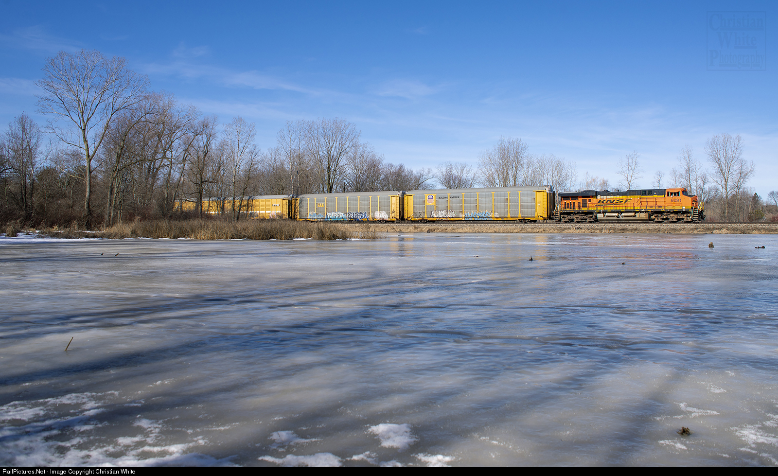 BNSF 6091 leads a 280 east through Haslett, Michigan (Okemos). After a week of warm and sunny weather, most of the snow that once covered this area has melted revealing the frozen lake.