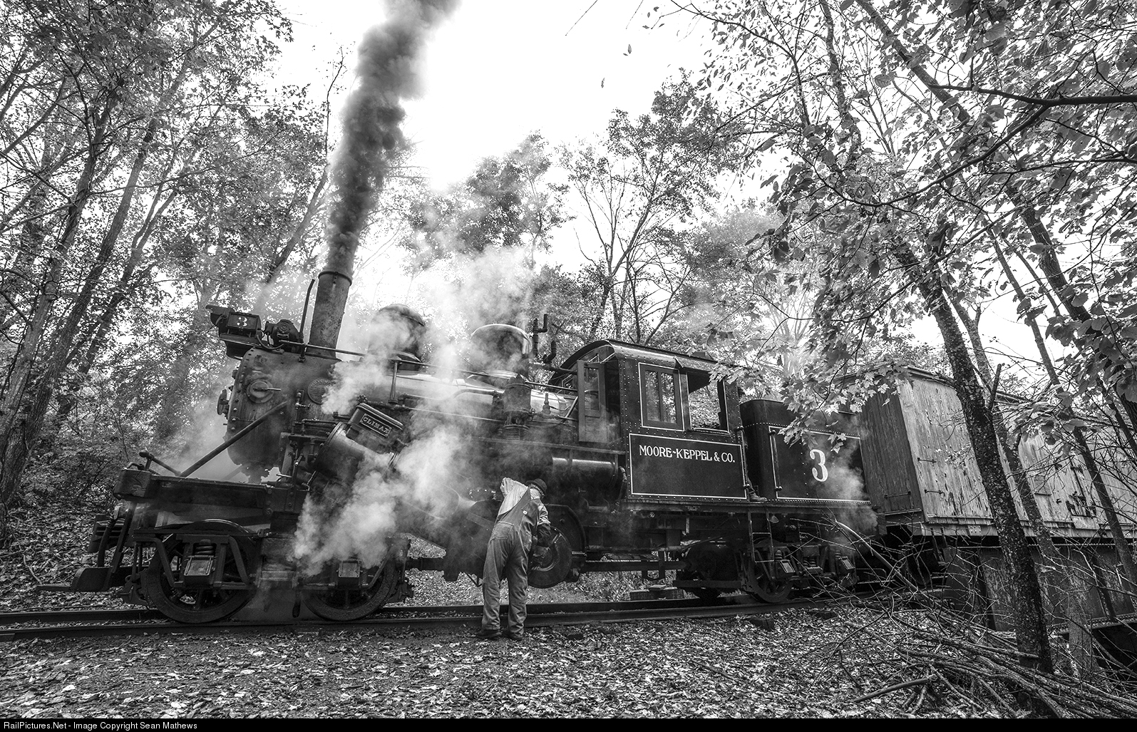 The engineer of two-truck Shay #3 provides some maintenance on an early fall day during a photo shoot organized by Chase Gunnoe.