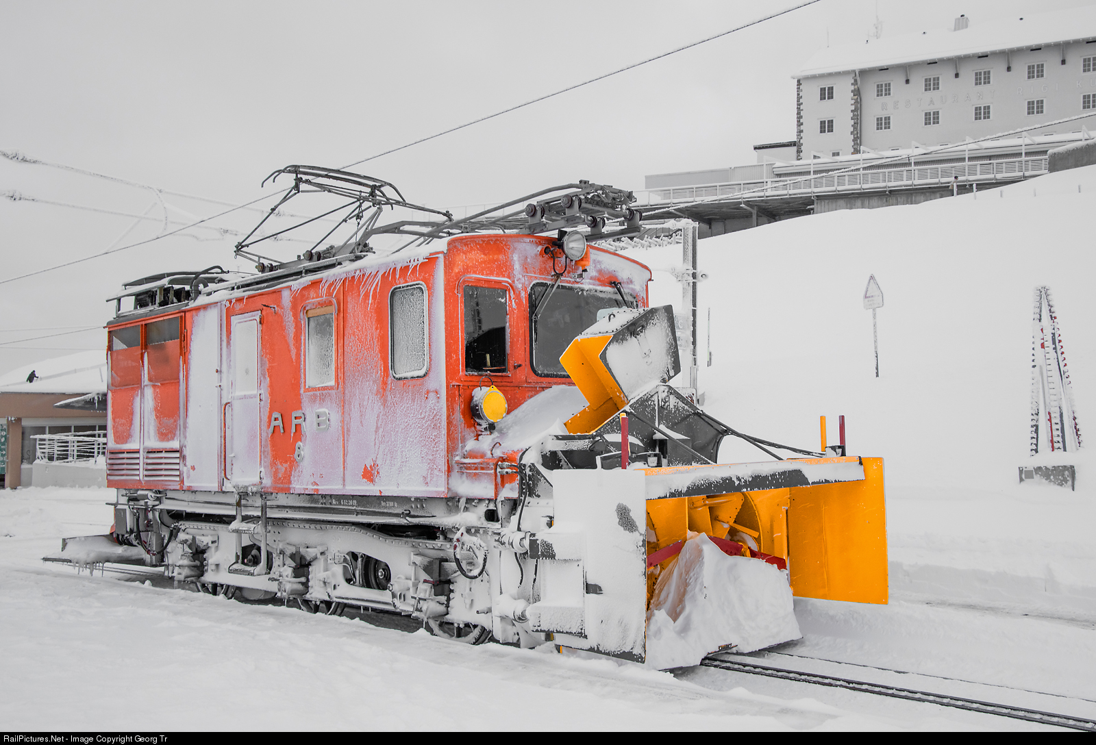 Cogwheel snow blower locomotive He 2/3 # 8 of the Rigi Bahnen on Rigi Kulm. This vehicle was built in 1930 by SLM and MFO for the Arth-Rigi-Bahn (ARB). Carbody with blower unit can be turned 180 degree on the frame. The Arth-Rigi-Bahn started to run in wintertime in 1928 and it was quickly discovered that a plug was not enough. So this electric snow blower locomotive was ordered.