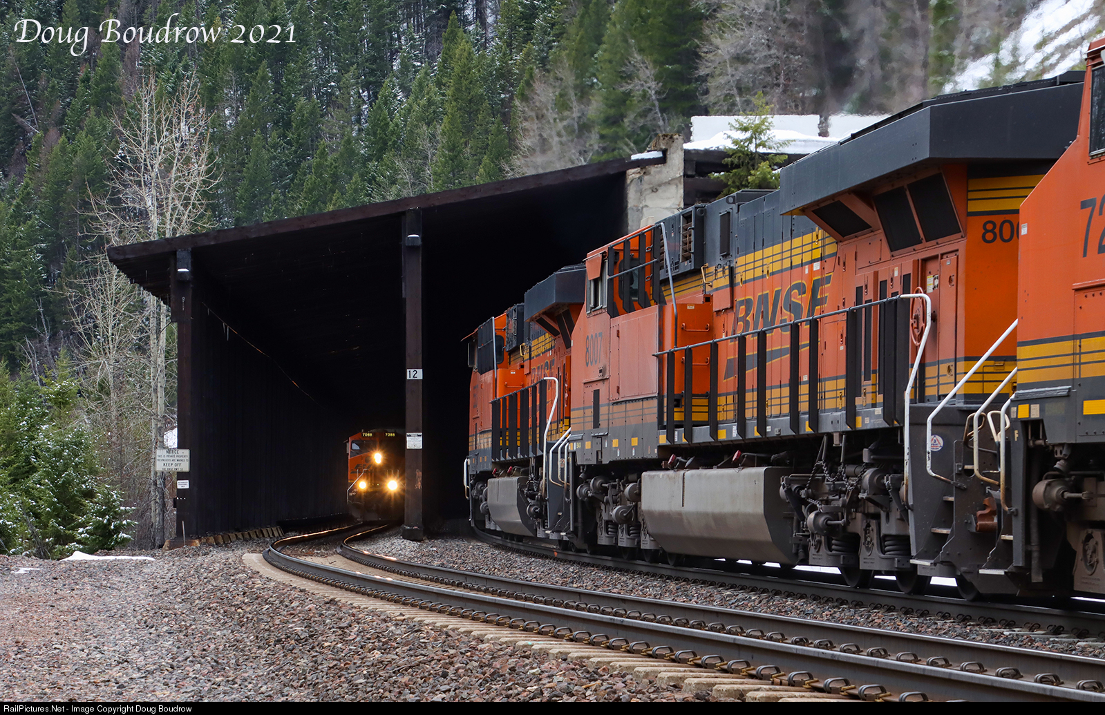 | Two autorack trains with all GE power are seen meeting Snow Shed 12 in Essex, Montana. The snowsheds protect the passing trains as they traverse the avalanche zones on the West side of Marias Pass along the BNSF Highline Subdivision. |