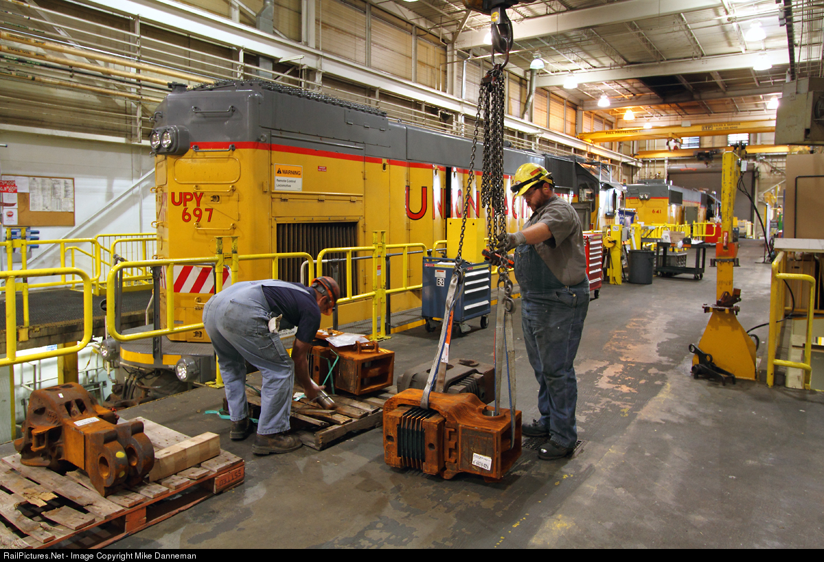 At Union Pacific’s Kansas City Locomotive Facility, two mechanical department employees install new draft gear on UPY EMD GP15-1 No. 697 on October 21, 2013.
