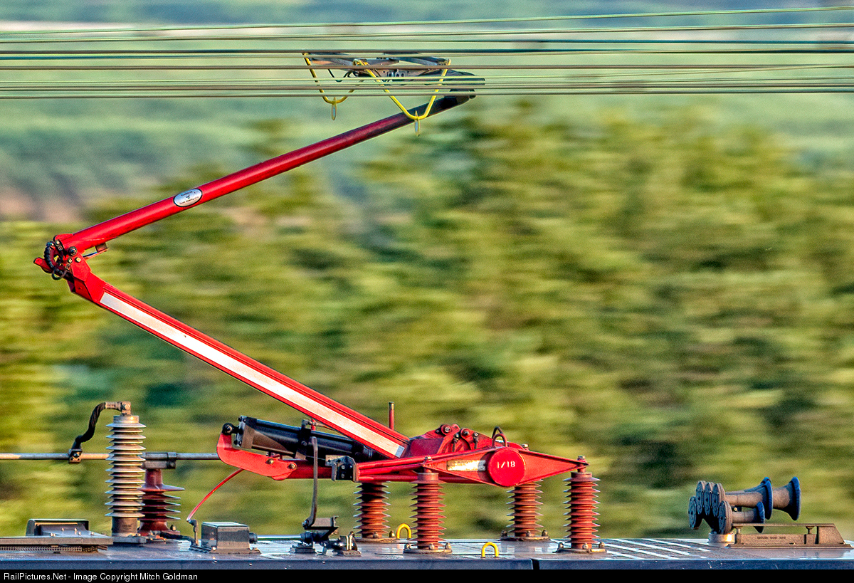 An NJT ALP-46A TransTech pantograph captured at speed drawing 12 kV/25 Hz in a minimally cropped high res pan at 1/60th - through Secaucus, NJ.
