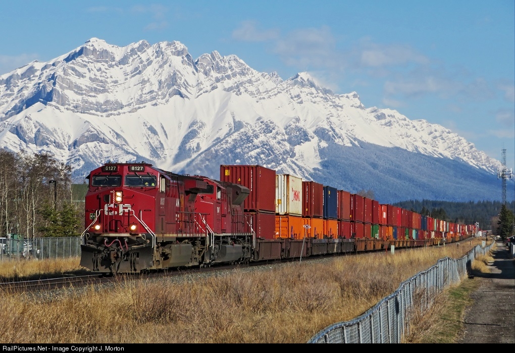 | CP 8127 leads train 100 east through Canmore. It's springtime in the Rockies. Temperatures are warming and getting quite pleasant. That being said, it is not uncommon to get the occasional snowfall from time to time. Even Cascade Mountain (in the background) received some snow overnight. |