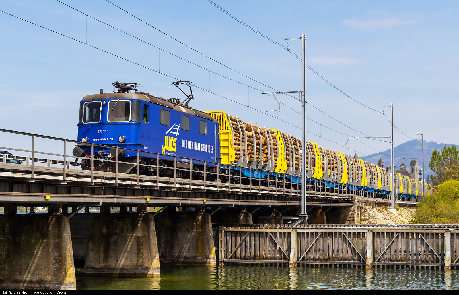 | Re 430 # 115 of the Widmer Rail Services AG (WRS) is pulling freight train 69464 from Schwerzenbach via Wetzikon-Rapperswil-Pfäffikon SZ-Zürich Altstetten-Lenzburg-Olten-Langenthal-Huttwil to Menznau West (Swiss Krono), with 6 loaded "Gigawood" double cars and (not visible) in the rear tractor (small diesel shunter) Tm 232 # 517. The train is crossing the Lake Zürich on the dam between Rapperswil and Pfäffikon SZ. |