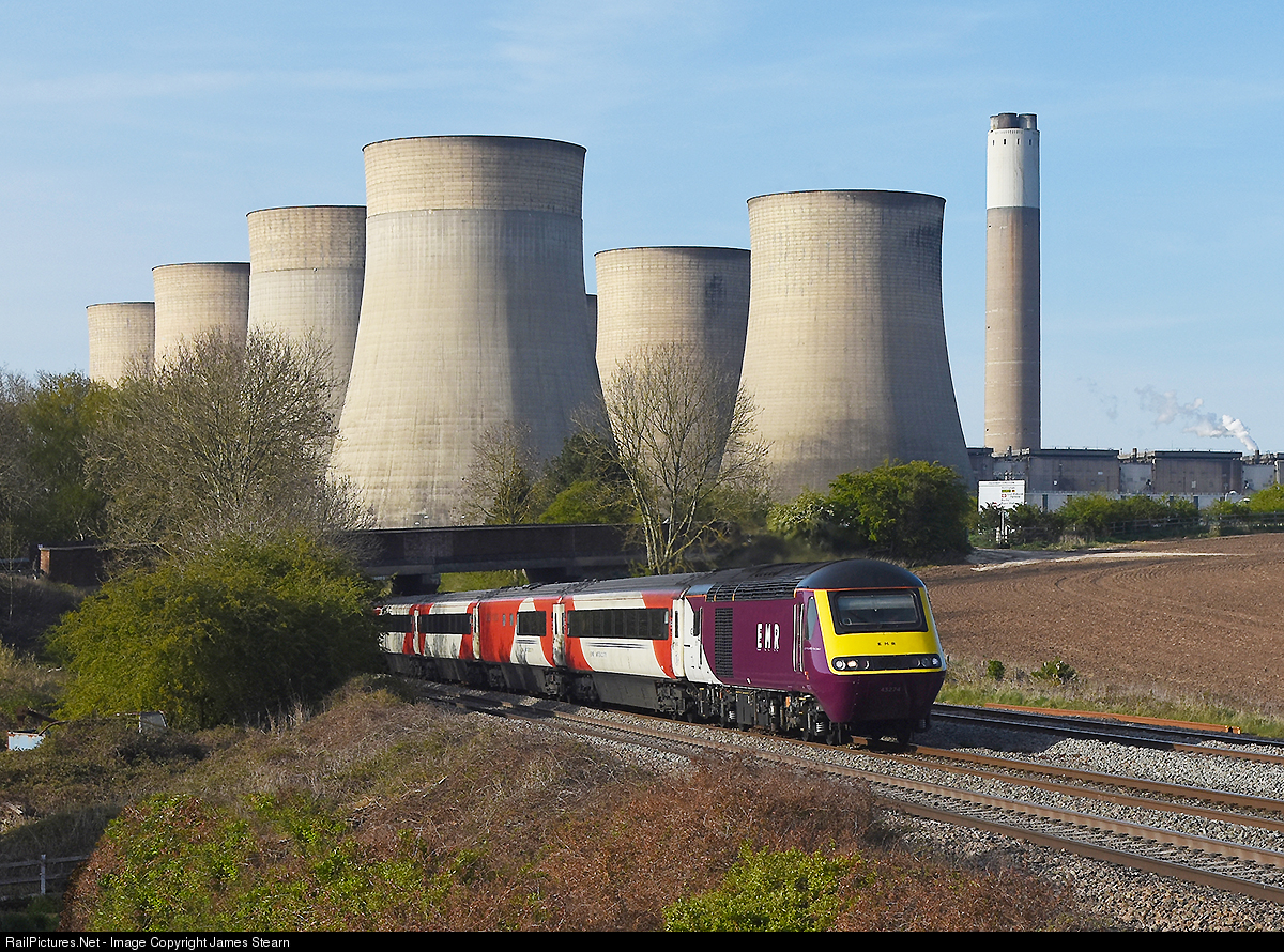 Still shining in it's new coat of paint, 43274 the only power car to wear the new East Midlands Railway colours has just departed from East Midlands Parkway working the 17:45 Nottingham - St Pancras, in a scene dominated by the 1968 built Ratcliffe Power Station.