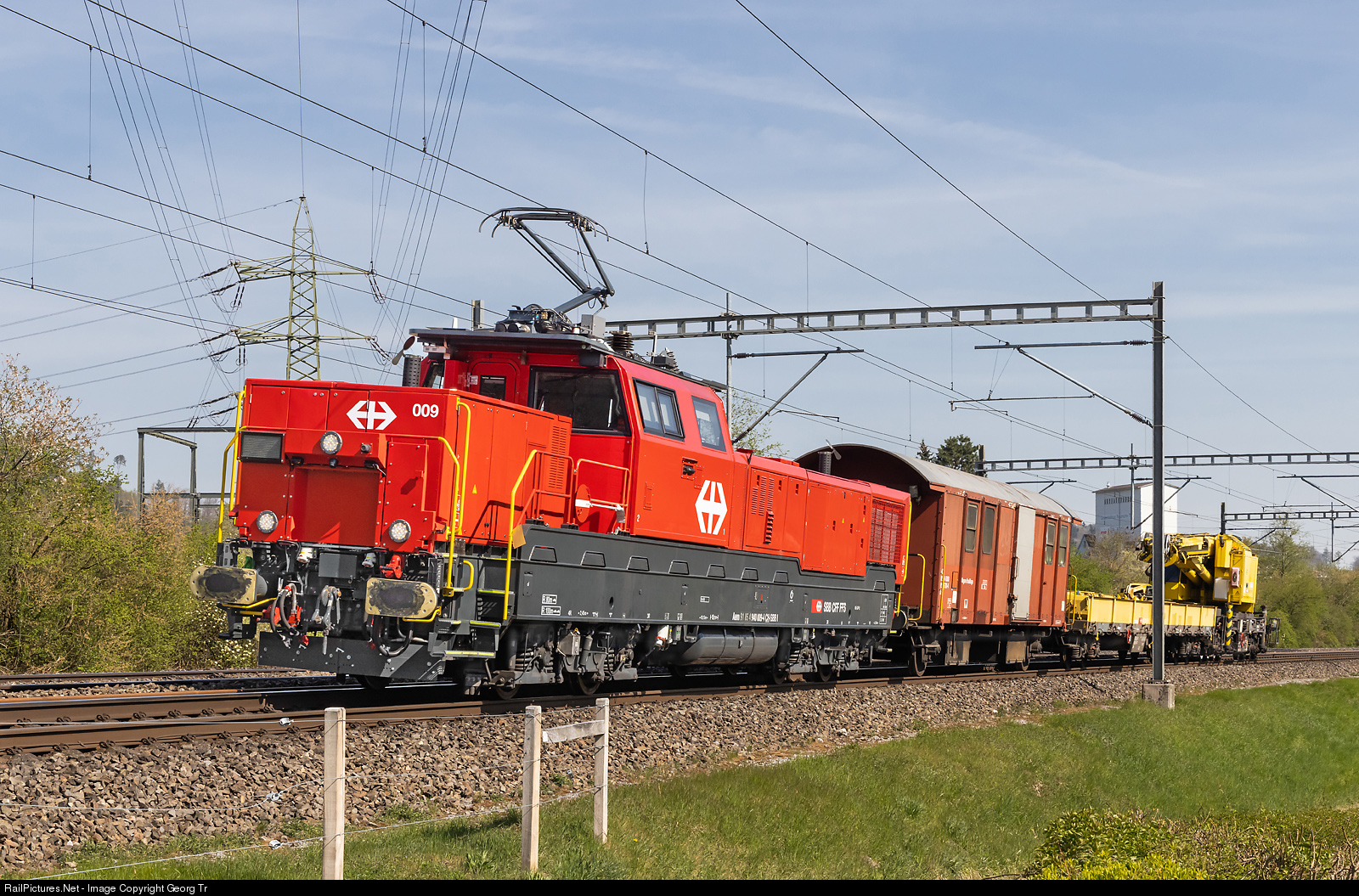 | Diesel/electro locomotive Aem 940 # 009 of the SBB is pulling a railway crane from Winterthur freight yard to Limmattal shunting yard, between Winterthur and Winterthur Tössmühle. |