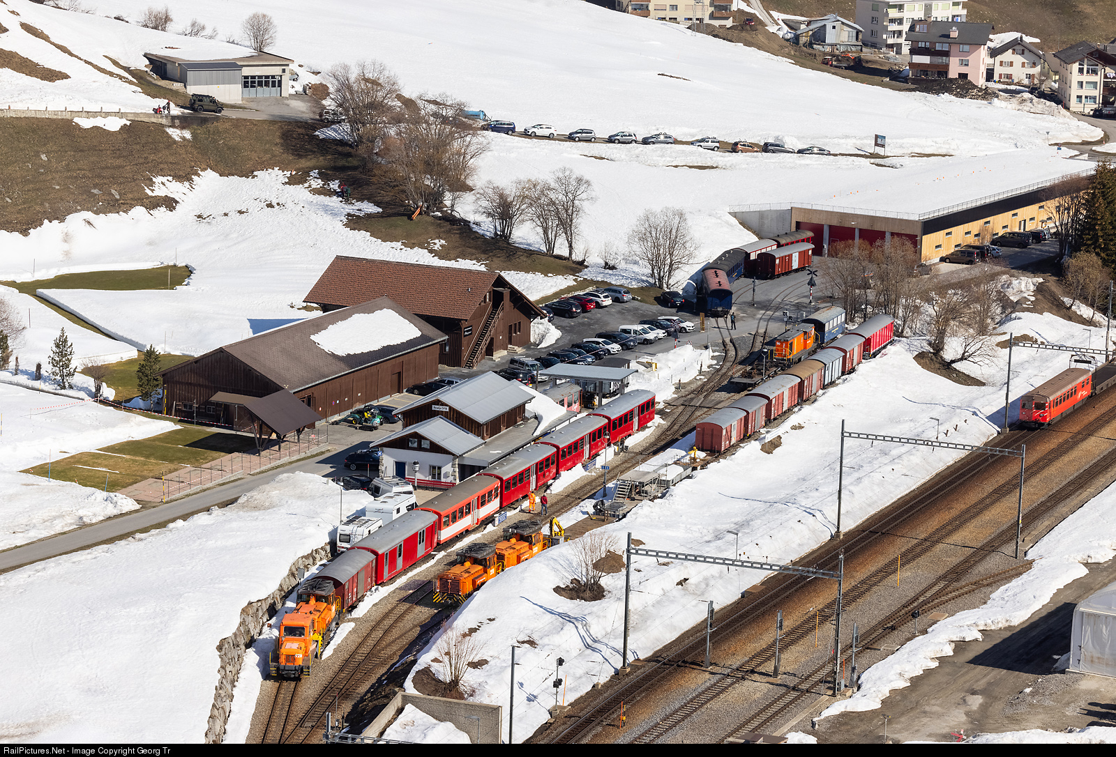 A view from the mountain to the station Realp DFB and the new car shed in the background. In the foreground right are the tracks of the Matterhorn-Gotthard-Bahn (MGBahn) in Realp station, with a cab car of the car transport train through the Furka base tunnel to Oberwald. On track 1 of Realp DFB we can see stabled cars of the "diesel train", lightweight cars of the former Brig-Visp-Zermatt-Bahn, now owned and operated by the DFB for the "hikers train", pulled by diesellocomotive HGm 4/4 of the MGBahn. Although on track 1 is diesellocomotive Gm 3/3 "Moyse" # 233, former Rhaetian Railway, now purchased by the DFB for shunting duties in Realp. The foremost vehicle is the diesel snow blower "Schleuderina" Xrot m # 9216 former Rhaetian Railway, built by RACO and Beilhack in 1958. On track 3 are two more "Moyse" dieselocomotives Gm 3/3 # 231 and # 232. The orange diesellocomotive more in the background is Gmf 4/4 # 90 of the Furrer and Frey company, which is the former "Faur" built CFR 87-0023-9 from Romania, purchased in 2014.