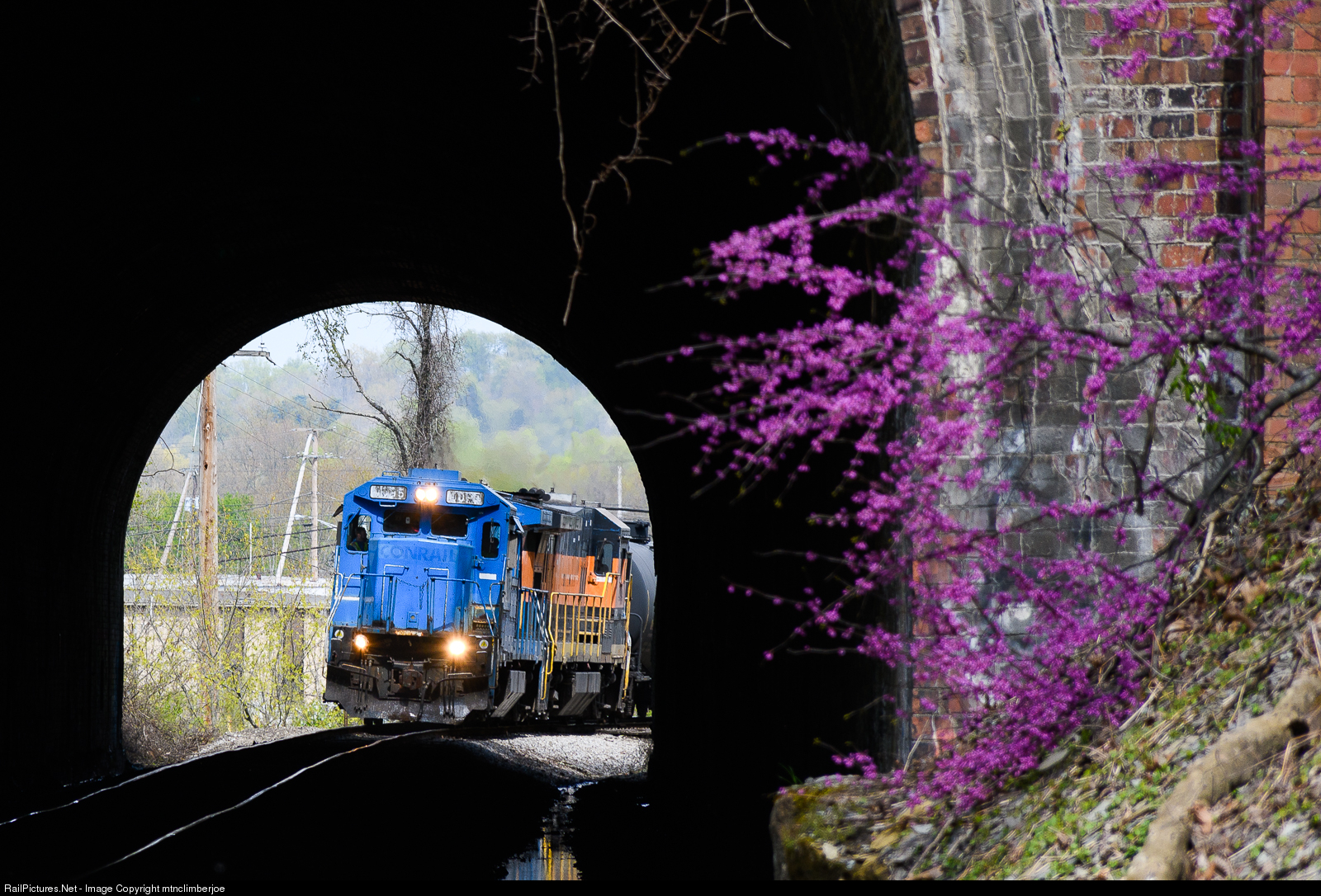 Spring flowers are in full bloom in Cambridge, Ohio as the Ohio Centrals ZVL local begins its return trip to Zanesville. A of pair of GE Super 7's lead the train as it is about to enter the east portal of the Cambridge Tunnel.
