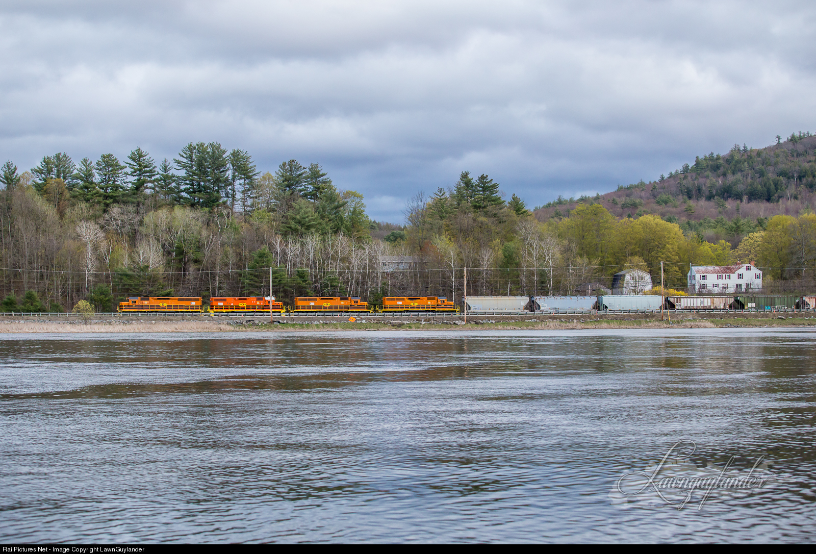 | I had one foot in Vermont and the other standing in the waters of the Connecticut River in New Hampshire when I snapped this northbound 323 in the last rays of light on the last day of April. An SD40M-2 leads a newly acquired GP38-2 and two veteran SD40-2s with a fairly short train. After Pan Am's EDBF rolls south for the night, the line will again be quiet until early Monday morning. |