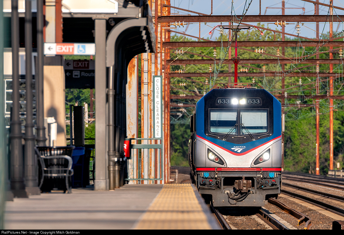 | AMTK No. 633 leads an eastbound Regional Express through Croydon, Pennsylvania, running on the outside track. |