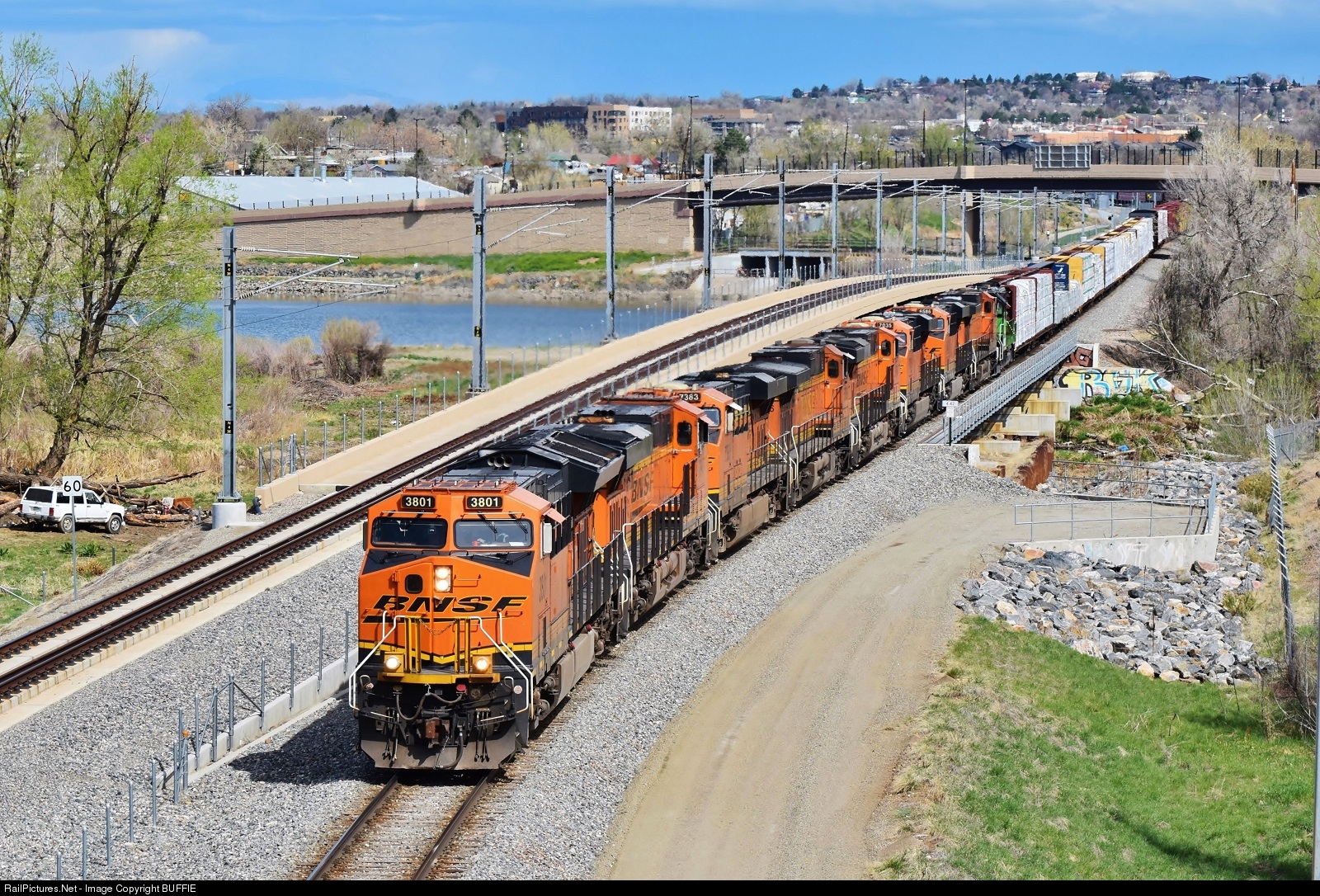 BNSF 3801 (ET44C4) leads 8 other engines and a long freight towards Denver, Colorado.