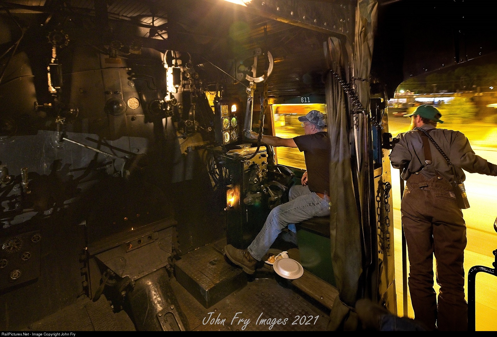 Railroading is about interruptions. Not just having a trip full of green signals being interrupted by a 3 hour wait for an opposing train, or a hot box detector tagging the next to last axle, but interruptions to life. It means leaving a cart full of groceries in the isle because the call came. It means having Christmas morning postponed until you get back home because there was freight to move. In this case, it means dinner will have to sit on the floorboard until the next move is completed. Even for a staged photo event, Engineer Bob Saxtan got about 2 bites of supper in before the call came over the radio to relocate the 611 to the next location on the museum grounds during the night photo shoot at Spencer on May 1, 2021. To the staff and volunteers, many who are or were professional railroaders who are no strangers to how interruptions are just a fact of life on the railroad, worked long days and late nights to prepare for and carry out this event. A big hats off to all of those who came early in the morning, stayed well into the night, and rolled with the interruptions to their plans(and to a full night’s sleep!) to ensure all of the challenges that occurred were overcome to realize a great experience for so many.
