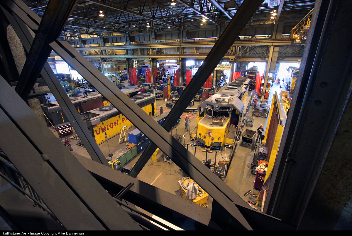 A view from above inside the main shop building at Union Pacific’s Downing B. Jenks Shop at North Little Rock, Arkansas, sees locomotives gathered for rebuild and overhaul, including UP EMD SD40-2 No. 3071 being rebuilt into a SD40N, on May 18, 2015.