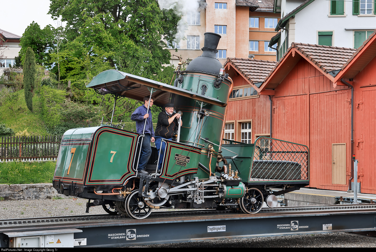 Cogwheel steamlocomotive H 1/2 # 7, built in 1873 by the SLM Winterthur (very first locomotive of this factory) for the Rigi Bahn from Vitznau to Rigi Kulm, on the first test run after 12 years exhibition in the Swiss Museum of Transport in Lucerne. This is the only operational cogwheel steamlocomotive with an upright boiler. The locomotive was withdrawn in 1937 and from 1959 exhibited in the then new Swiss Museum of Transport (VHS) in Lucerne. For the 125 years anniversary of the Rigibahnen in 1996, the locomotive was rebuilt by the SLM and ran on the Rigi Bahnen. One year later, there were more trips for celebration of 150 years railway in Switzerland 1847 to 1997. And in 2009, the locomotive was on visit on the Rigi again. In 2021, the Rigi Bahnen are celebrating 150 years of operation and the popular locomotive # 7 is again part of the jubilee. After a successful testrun is the locomotive standing on the traverser of the depot Goldau, with engineers Paul Gwerder and Martin Horath. Locomotive # 7 is part of the collection of the Swiss Museum of Transport in Lucerne and was and is always lent for the trips on the Rigi.