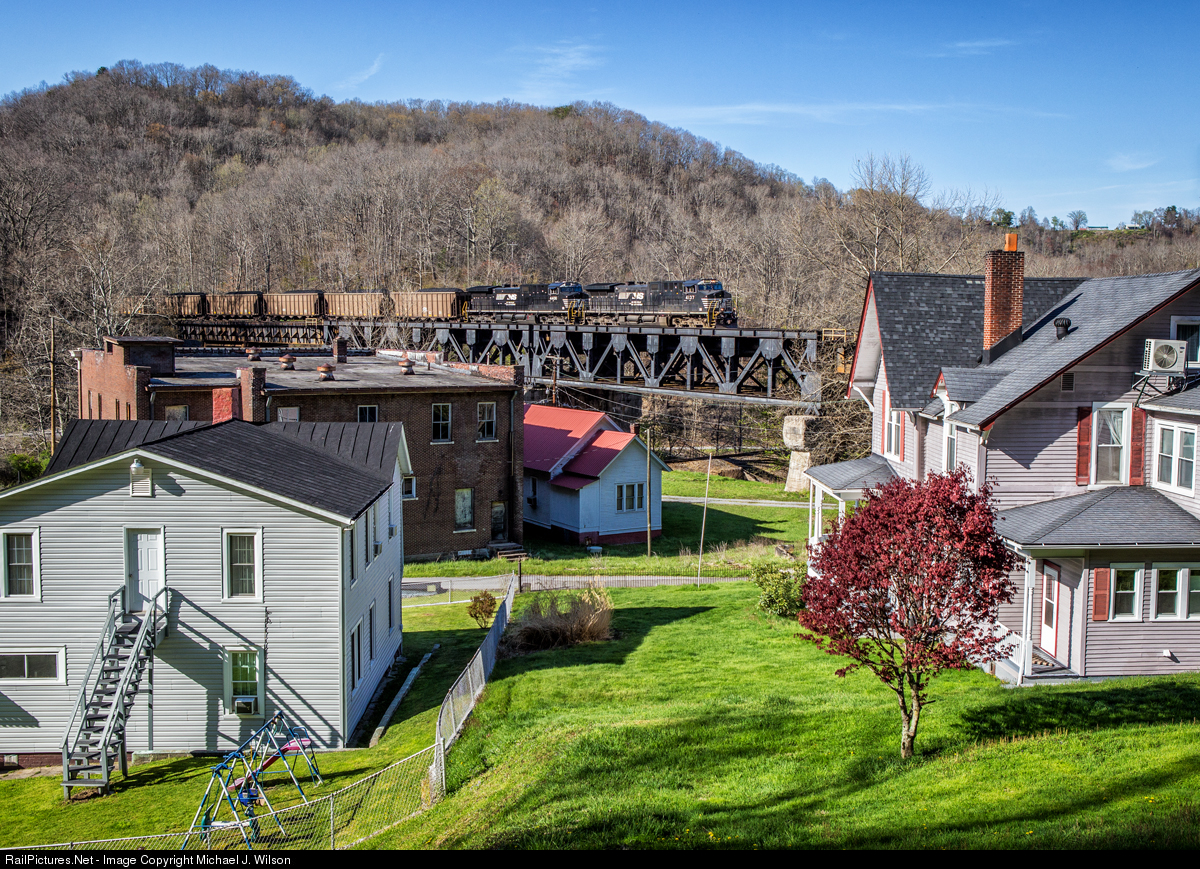 NS #4137 and #4408, hauling a loaded eastbound coal train, have just crested Elkhorn Grade and are crossing Cooper's Trestle in Coopers, WV on the afternoon of April 26, 2021. This coal will be bound for export at the ports of Norfolk, Virginia. Below the trestle is a church which was, according to town history, originally built by John Cooper, a coal mine owner and founder of Coopers, WV, to serve the white congregation in his town during the era of segregation and Jim Crow laws, prior to the Civil Rights Act. Out of the frame "across" the tracks is another church built to serve the African American congregation in the town that is twice the size of the "white church" and is still used today. Next to the church in the frame is the brick company store for the town, unused today.
