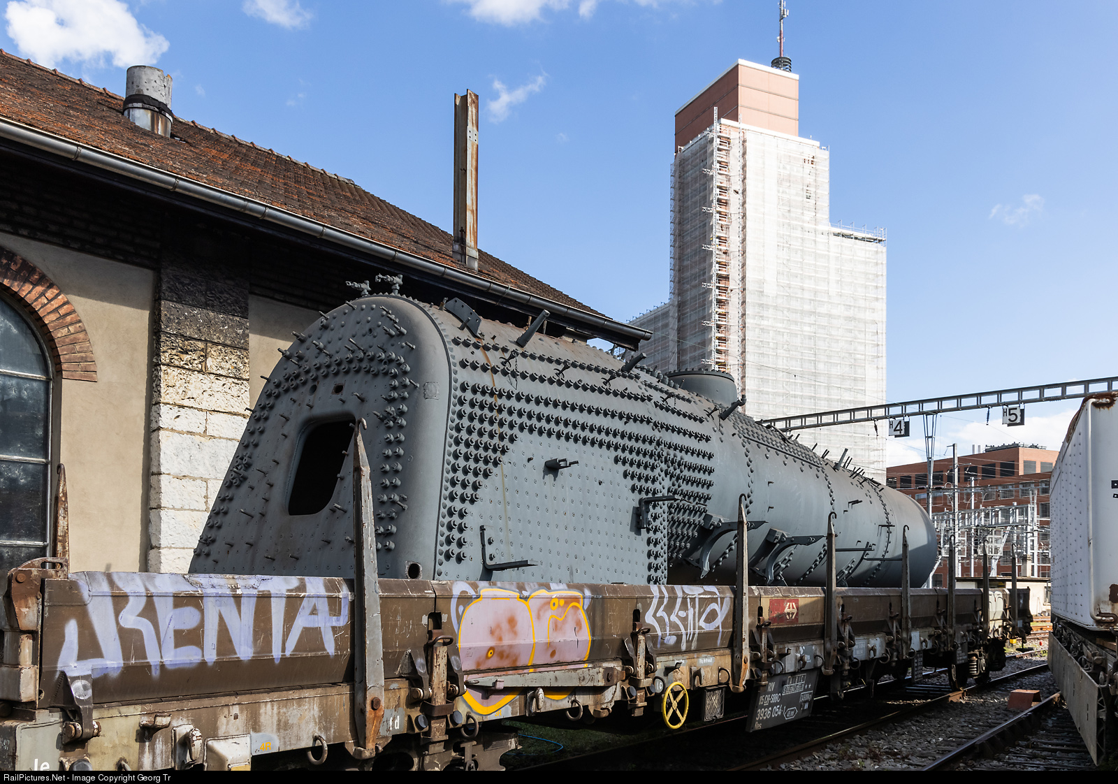 This large boiler with a weight of approx. 25 tons was built in Lima/Ohio/USA in 1945. It belongs to the 2-8-2 "Mikado" steamlocomotve 141 R # 73, which was delivered to the french SNCF and nearly 30 in service. Withdrawn in 1974 and privately owned now, the boiler was loaded in Winterthur on a flat car for the transport to Vallorbe to the new owner.