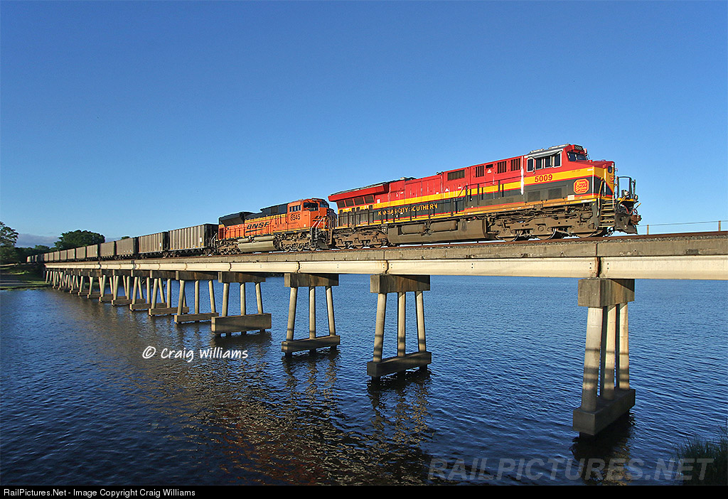 | A Martin Lake, TX, bound coal train rolls across Caddo Lake on the KCS Shreveport Terminal Sub. Now that I have been to Shreveport, I understand the move these trains do going to the UP there. They have to change directions which also means they re-DP the trains. So the KCS has to have decent DP power leaders on the trains when they get to Shreveport for that move. This KCS DP unit will be the leader on the UP side here in 20 miles when the train heads west to Martin Lake from Shreveport. |