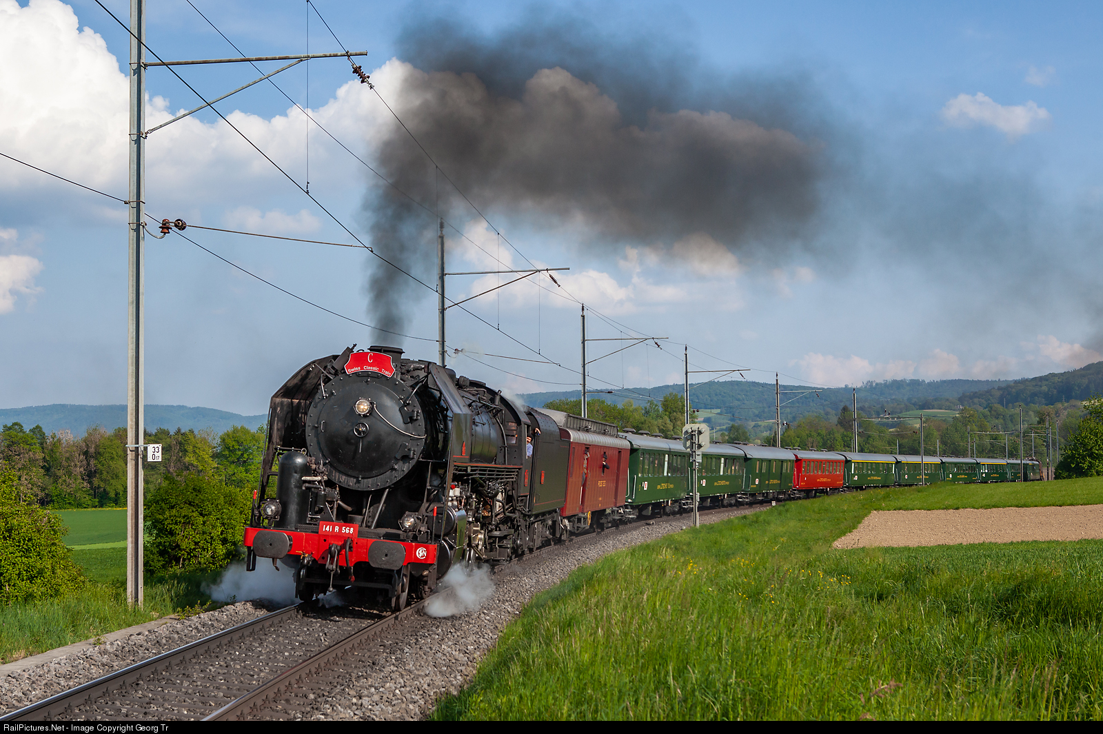 | 10 years ago, Baldwin built 2-8-2 "Mikado" 141 R # 568 (former French Railways SNCF) with the "Swiss Classic Train" made two round trips from Winterthur through eastern part of Switzerland on may 1th. Locomotive and cars are owned by "William Cook Rail" of Andrew Cook from the UK. The train is tackling the 1.2 % grade from Stein am Rhein up to Etzwilen with full speed. The cars of the "Swiss Classic Train" are former heavy steel cars of the SBB, refurbished in Ceske Velenice/Czech Republic and labeled as Bern-Lötschberg-Simplon at the desire of the owner. The car behind the locomotive is a former french mail car, now rebuilt as tools and staff car. Since 2017 locomotive and cars are based in Vallorbe. |